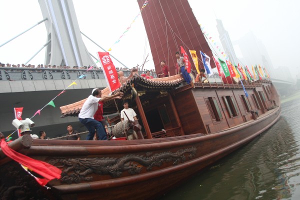 那么,当年的皇家龙船究竟是何模样?明万历四十七年(公元1619年),朝鲜国使臣梨川出使中国,在《梨川相公使行日记》中记载:七月“二十九日庚戌,晴。留通州。食后,三行并辔向船所。龙舟一只,泊在江浒,悬金牌于船头,书:‘上用水殿’四字。窗户玲珑,涂以云母。六部画船,依次摆列,制造精丽,无异于龙舟。”字里行间不难想象,这些皇家船舶朱棂雕檐、镂金错彩,既华丽又庄重,尽显皇室气派。