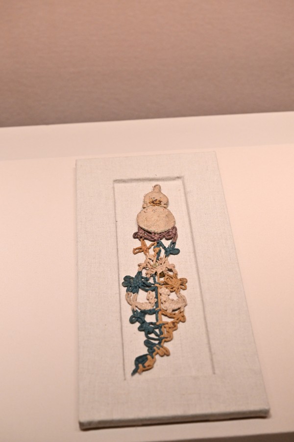 展柜中摆放着一件明黄绸彩绣折枝梅葫芦形针扎。这件文物从上至下分为三部分,最上面的系带从顶部葫芦口抽出并与内部的囊芯相连;中间为葫芦形的针扎主体,以黄色平纹绸为底,葫芦上下各绣折枝梅花一朵;下部为一条蓝褐色带饰。孙珂介绍,针扎是古代丝织手工匠人使用的物品,他们将针扎在上面,不仅防止丢失也避免扎到别人,此外这件针扎的底部还有一个口子,可以容纳纺线。