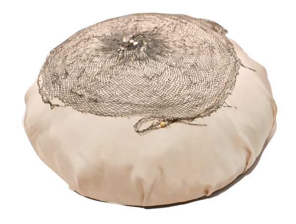 一旁摆放的发髻网罩也是鸽子洞中发现的文物,孙珂猜测这也是当时女子佩戴罟罟冠时用到的物品。这件发髻网罩呈现圆形渔网状,网格为方棋纹饰,从顶端中心呈圆环漫射形编织,大致有34圈,第一圈共有64个圆孔,随后依次递增。“佩戴罟罟冠时,可能需要将长发盘起,并用这种网罩包住,避免长发露在冠外。其实这种网罩现在仍在使用。”孙珂说。