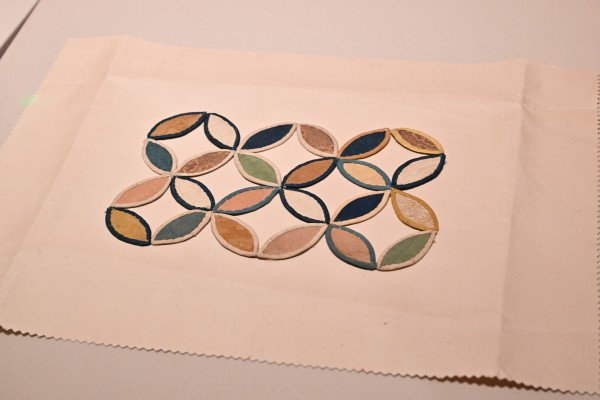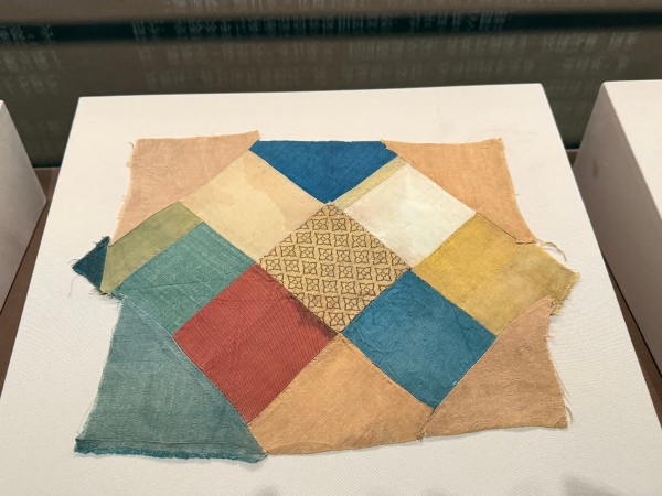 除了代表性纹样,鸽子洞中发现的丝织品上还出现了百纳工艺,即将不同的布料拼接在一起,组成一块更大的织物,不同的布料其颜色、工艺、纹样各不相同,这些布料组合在一起形成了一种特殊的美感。此次展出的百纳枕顶就是其中之一。枕顶中间呈九宫格,每个格子布料的颜色各不相同,包含褐色、白色、深蓝、浅蓝、绿色等颜色,由18种共20片丝绸材质的残片拼接而成。“虽是百纳,但是它的制作者应该用心设计了一番。这件枕顶的正中间是一片柿蒂纹织金锦,其余布料均为纯色绢或者暗花绫,也是由于这片织金锦的存在,使得整片枕顶从视觉上就高了一个档次。”孙珂又指着枕顶一角介绍其中的与众不同之处。百纳枕顶的右下角为一片棕色杂宝禽鸟纹纻丝,而“纻丝”就是后世所称的缎。缎的特点就是表面的浮线较长且有光泽。孙珂说,之所以能在这件织品上看到纻丝,正说明虽然纻丝在宋代就已经出现,但是到了元代才开始流行。