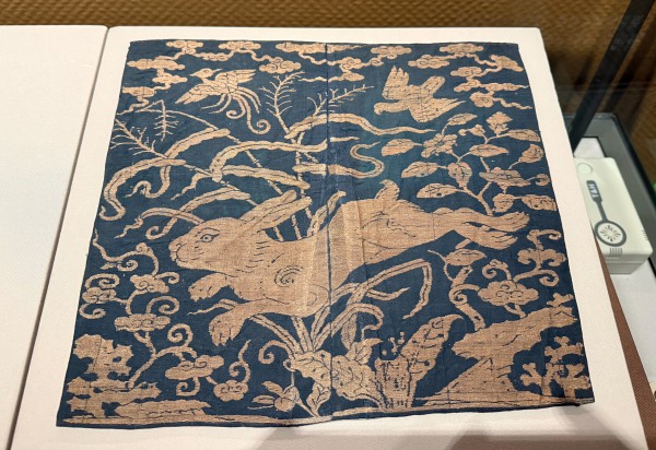 中间的屏幕上,身手矫健的兔子正在奔跑,兔子前后脚着地的同时,脚边相继长出花草、腾起祥云。画面一转,一只猛禽翱翔于天空,瞄准奔兔正欲捕猎。这一生动画面正取自展品中的兔纹织金锦。呈奔跑状的兔子占据作品中间位置,兔子身边环绕着一圈花草纹与卷草纹,上部织有卷云纹及两只翱翔的禽鸟。兔纹织金锦是当时官服上面的补子。首都博物馆副研究馆员孙珂介绍,自元代起,为了区分身份与地位,官服上开始出现绣着不同纹样的补子,内容多以动物为主,其中就包括兔纹织金锦上的“鹰逐兔纹”。此后明清两朝都在元代的基础上不断更新,将官服、补子与传统规制融为一体。