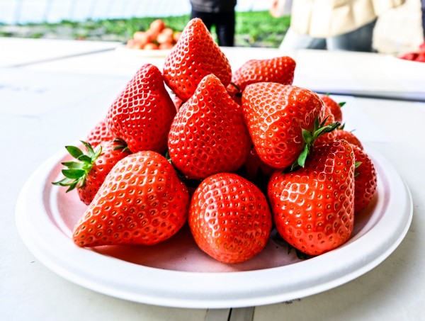 顺着孙健手指的方向望去,一排排高架栽培架整齐有序,翠绿的枝叶沿着支架舒展,京香2号的果实挂满枝头,圆锥形的果形匀称饱满,没有一丝空心,橙红色的果皮带着自然的光泽,在阳光下显得格外诱人。“我们做过对比,京香2号和红颜产量相当,但商品果率更高,而且它的硬度好、耐储运,不管是大规模生产还是观光采摘,都很有潜力。”孙健介绍,更值得一提的是,京香2号的叶酸含量极高,每100克鲜果叶酸含量达50多微克,是美国FDA测定标准的两倍,比欧美系品种也高出一倍,“这也是我们育种时重点关注的营养指标,希望能让消费者在品尝美味的同时能获得更多健康。”